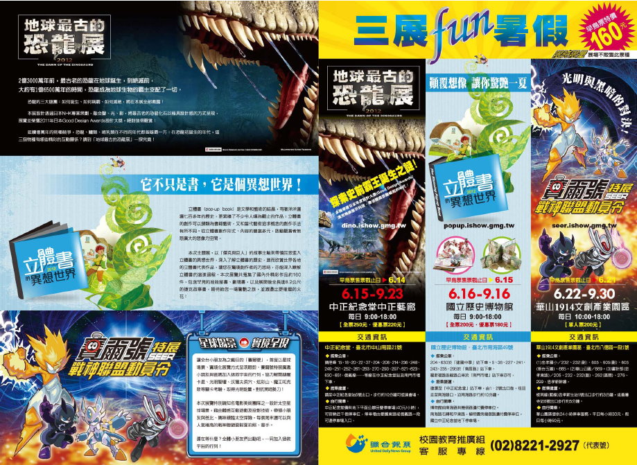 由聯合報系、悠友行銷股份有限公司精心策畫,三場精選的藝文特展,提供教師、校園同學們,最便宜的早鳥票購票優惠!任一特展只要團體訂購四張以上,即可使用貨到付款的方式取票,並且享有比現場票價更划算的價格!限量發行,售完為止!
