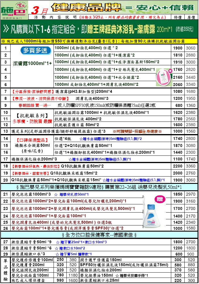 購買組合中凡是包含潔膚露一瓶者,再贈送潔膚露200ml一瓶!