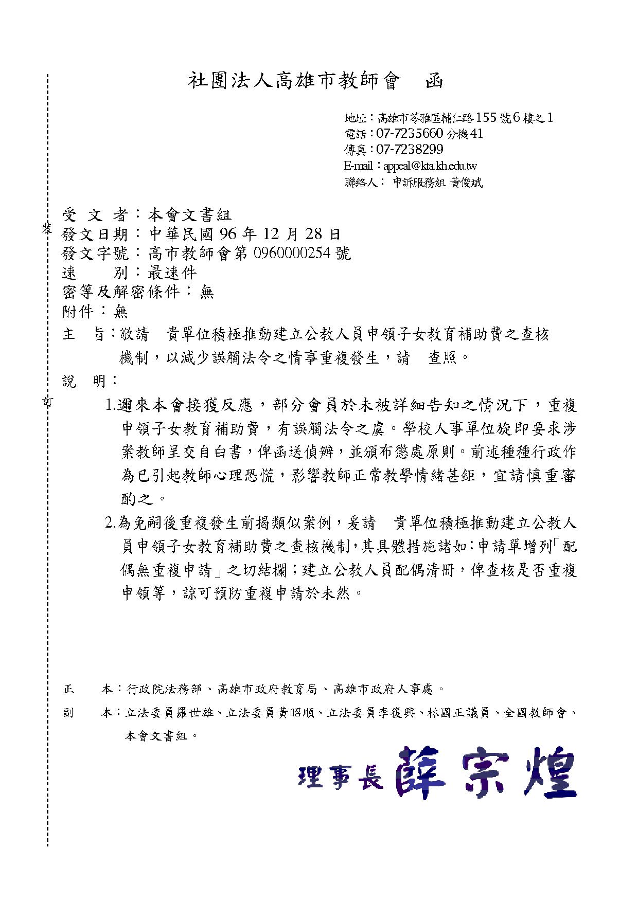 高雄市教師會函:呼籲有關單位積極推動建立公教人員申領子女教育補助費之查核機制,以減少誤觸法令之情事發生