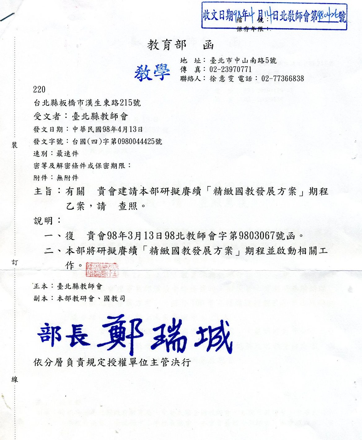 [教學部]教育部賡續辦理「精緻國教發展方案」回函