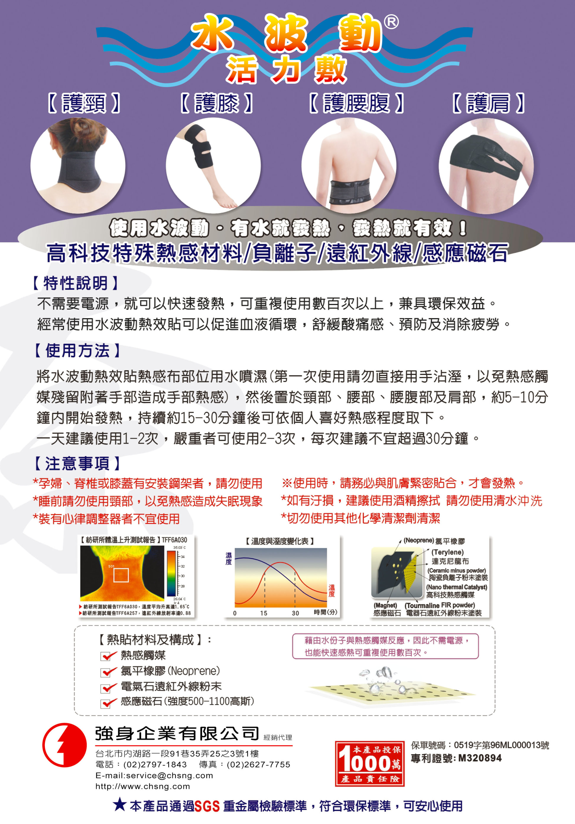 產品只要沾點水就能觸動身體細胞活化,產生連續波動共震反應並釋放大量熱能。但產品本身不會發燙,是目前市場上唯一獲得國家專利的產品,並且經紡織研究所測試遠紅外線放射率0.88微米,使用後平均體溫上升達1.65℃,是所有遠紅外線產品中效果最好的。此外並通過核能研究所及SGS重金屬檢驗機構之測試,檢測安全合格並經衛生署核發衛字號許可證書。