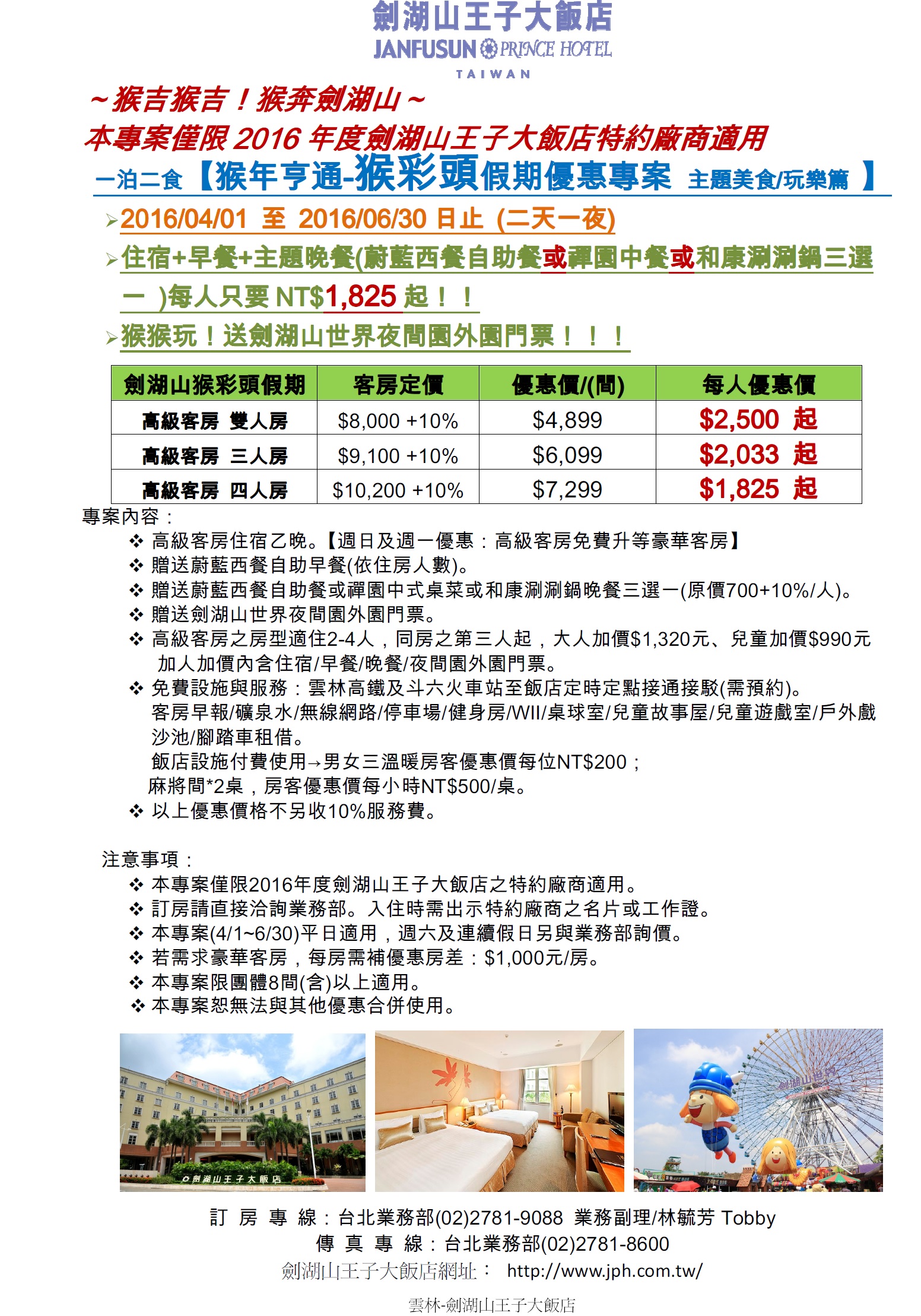 ** 本專案僅限2016年度劍湖山王子大飯店特約廠商適用