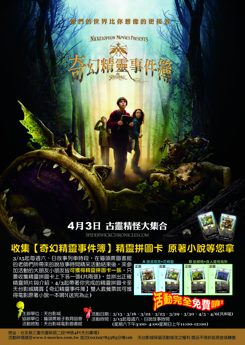 3/15起每週六、日故事列車時段,在貓頭鷹圖書館的老師們所帶來的說故事時間精采活動結束後,來參加活動的大朋友小朋友皆可獲得精靈拼圖卡一張,只要收集精靈拼圖卡上下各一張(共兩張),並拼出正確精靈照片與介紹,4/3起帶著你完成的精靈拼圖卡至天台影城購買【奇幻精靈事件簿】雙人套餐票就可獲得電影原著小說一本唷!(送完為止)