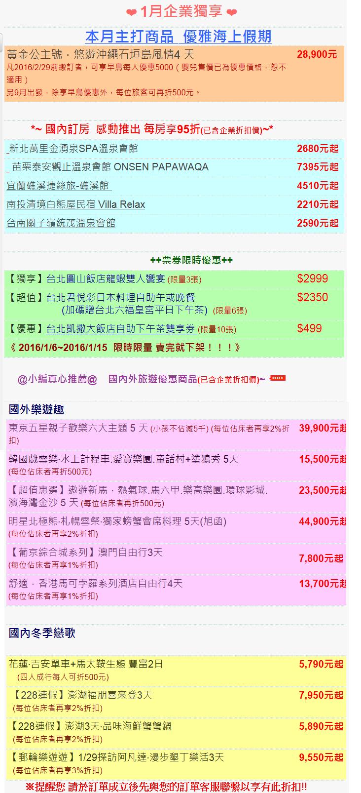[旅行社]易遊網1月份企業專區優惠商品1/31日止