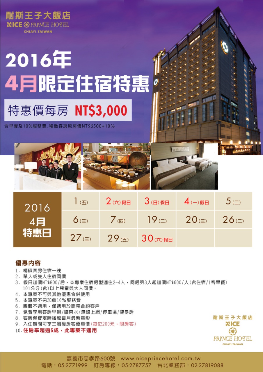 嘉義耐斯王子大飯店2016年4月住房優惠