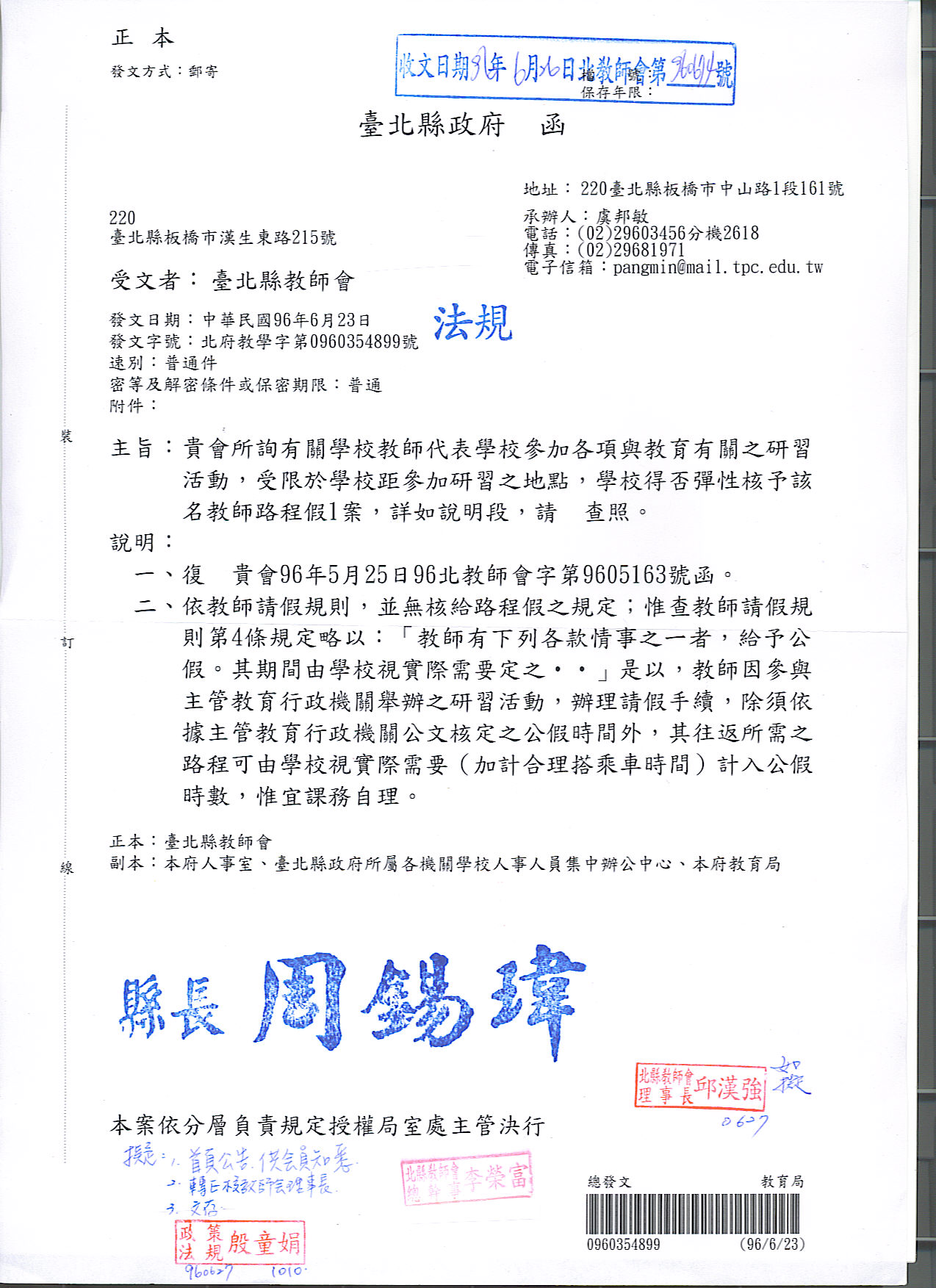 [函文]教師代表學校參加教育研習活動,得否核予路程假