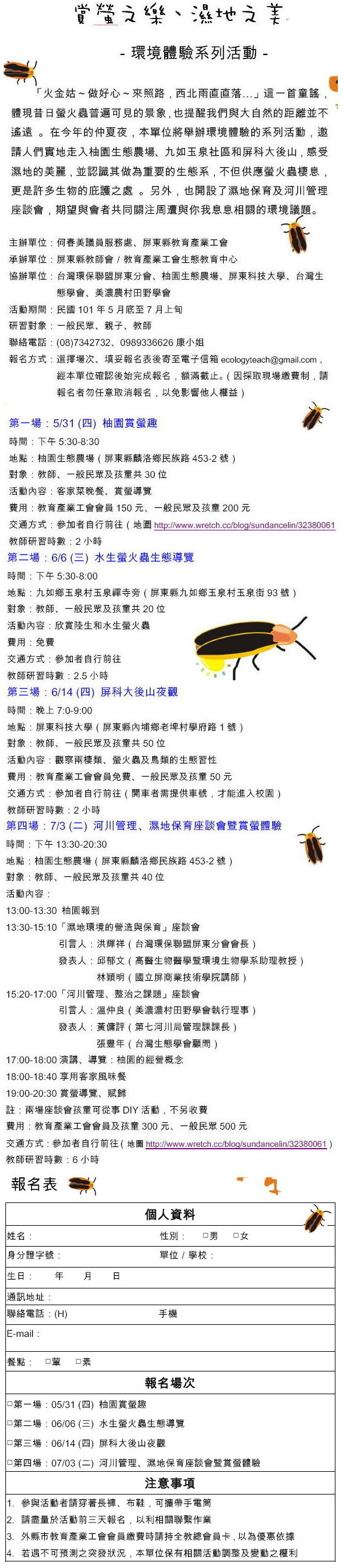 報名方式:選擇場次,填妥報名表後傳ecologyteach@gmail.com,經確認後始完成報名。