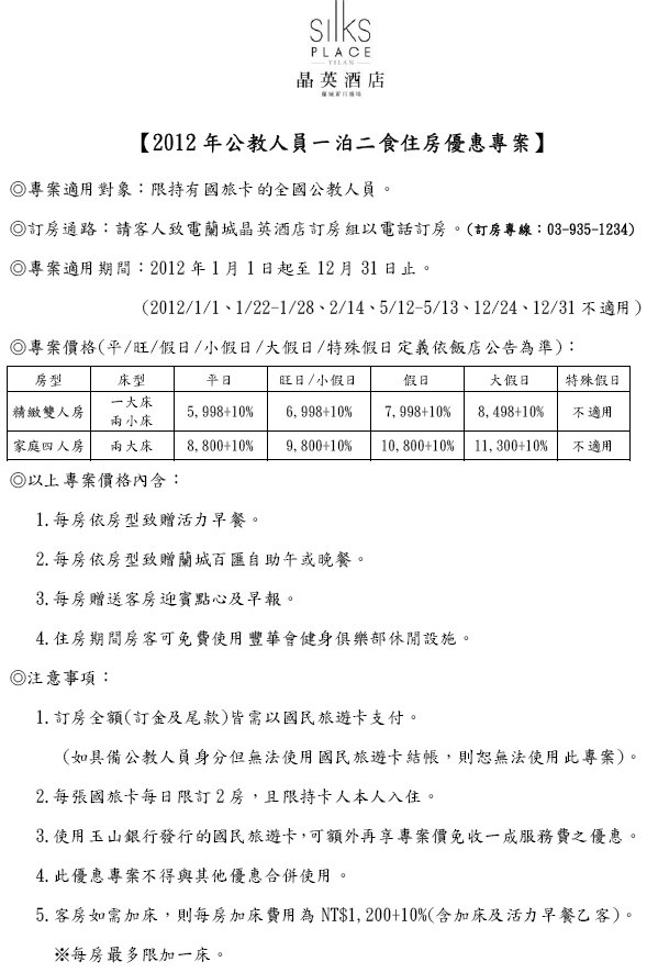[代轉訊息]雄獅旅遊集團特別規劃-蘭城晶英飯店合作專案