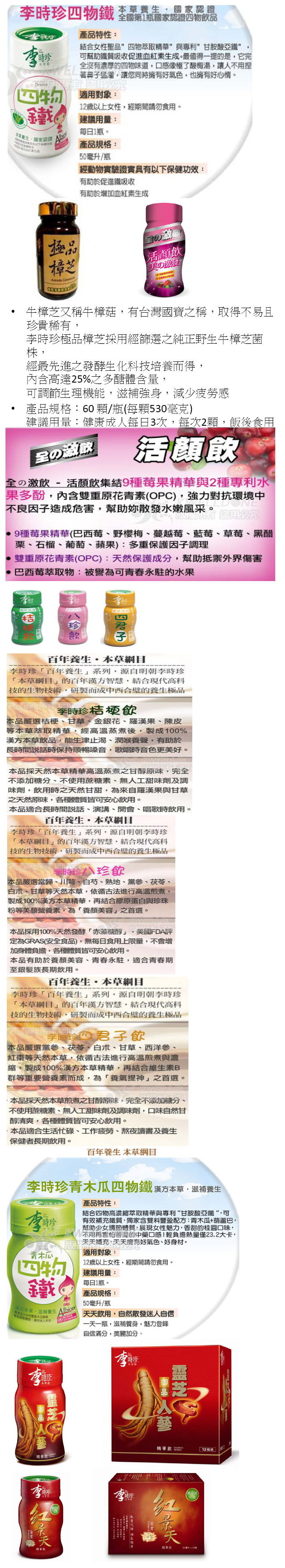 1.李時珍四物鐵12入+極品樟芝+活顏飲6入,928元