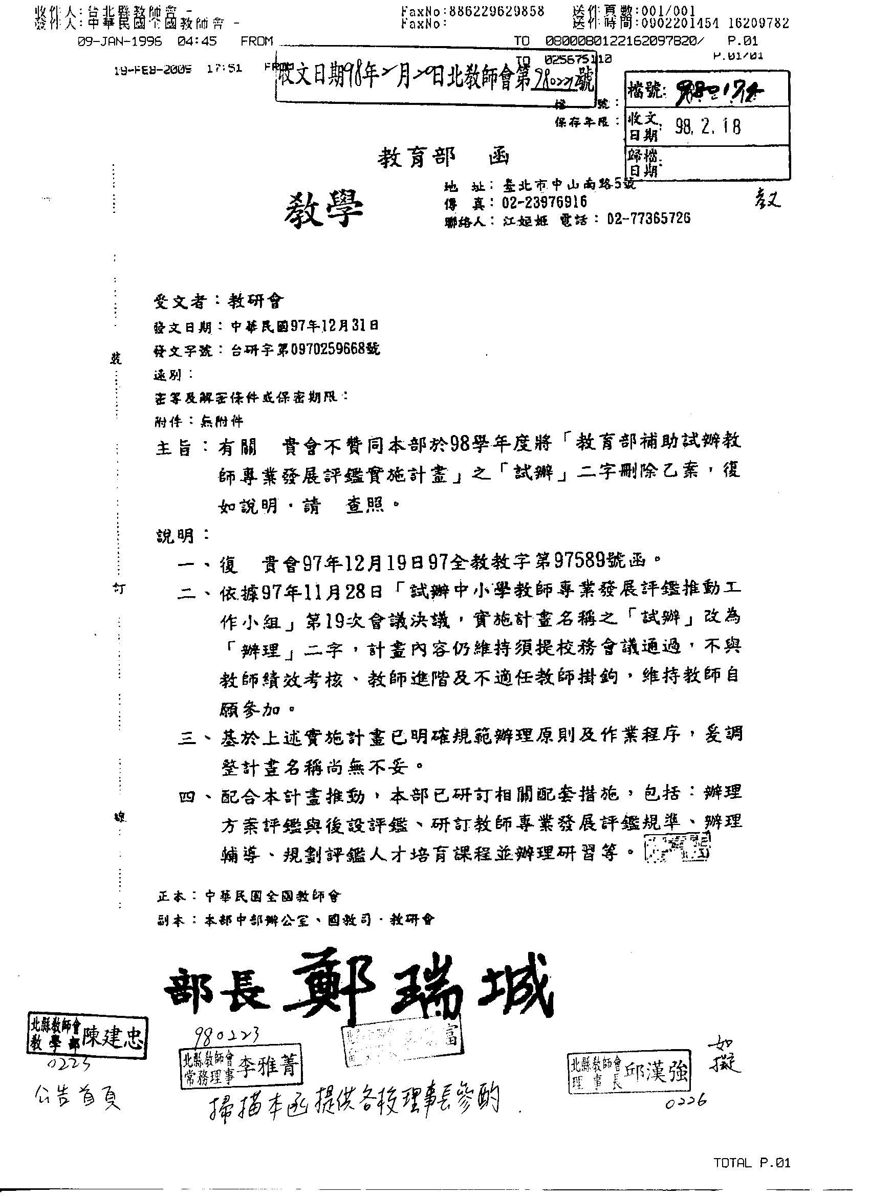 [重要公文]教育部「試辦教師專業評鑑計畫」相關公文