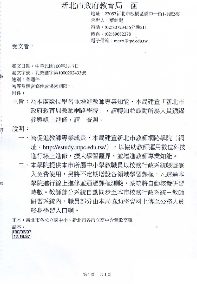 主旨:為推廣數位學習並增進教師專業知能,本局建置「新北市政府教育局教師網路學院」,請轉知並鼓勵所屬人員踴躍參與線上進修,請 查照。