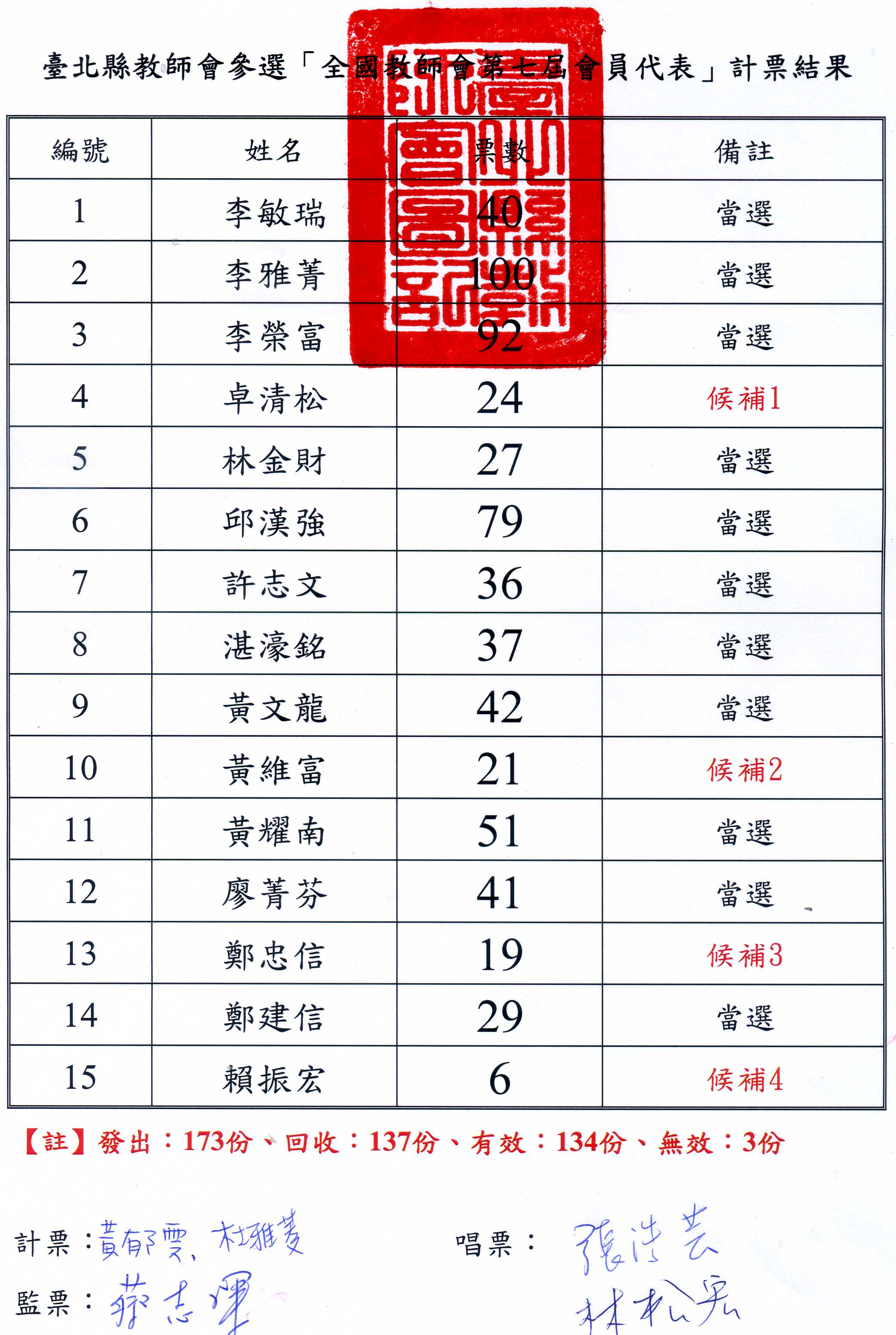 序 姓名 票數 備註