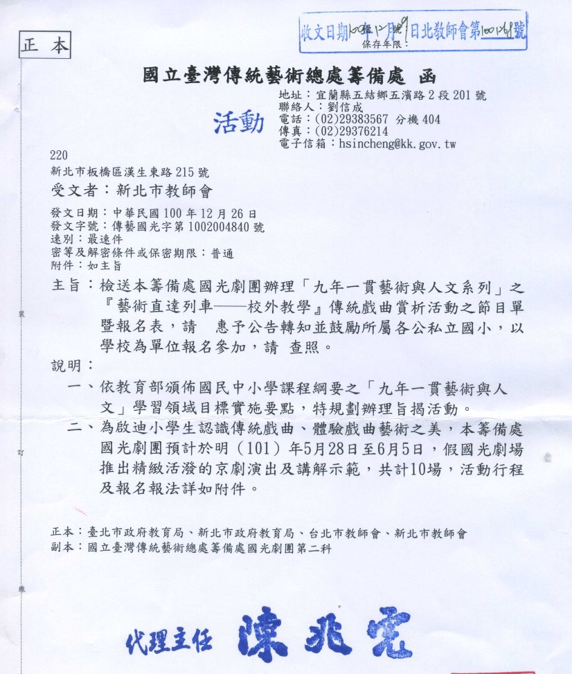 [代轉訊息]國立臺灣傳統藝術總處籌備處-『藝術直達列車-校外教學』傳統戲曲賞析活動之節目單暨報名表