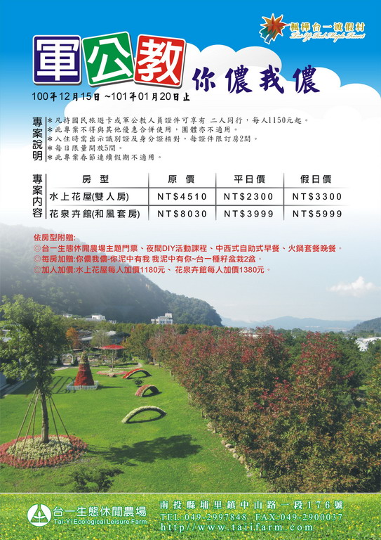 [代轉訊息]台一生態休閒農產住宿優惠