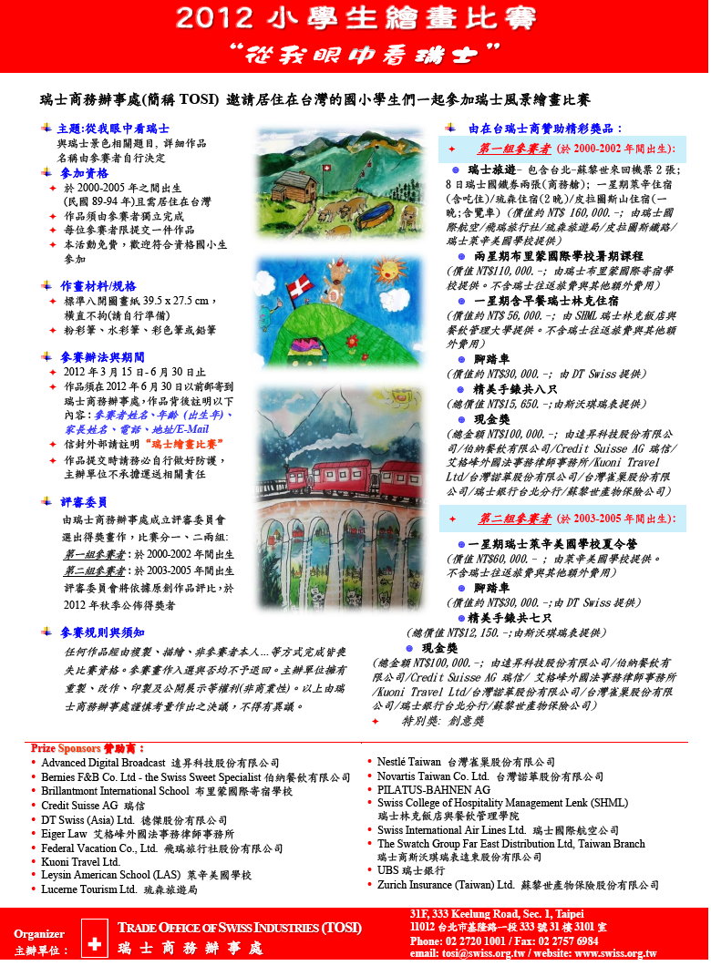 "2012小學生繪畫比賽- 從我眼中看瑞士"活動正式開始,誠摯歡迎就讀國小學生們一起參與瑞士風景畫比賽。本活動提供多項精美獎品。請於2012年6月30日前將作品郵寄至瑞士商務辦事處。詳情請見附件