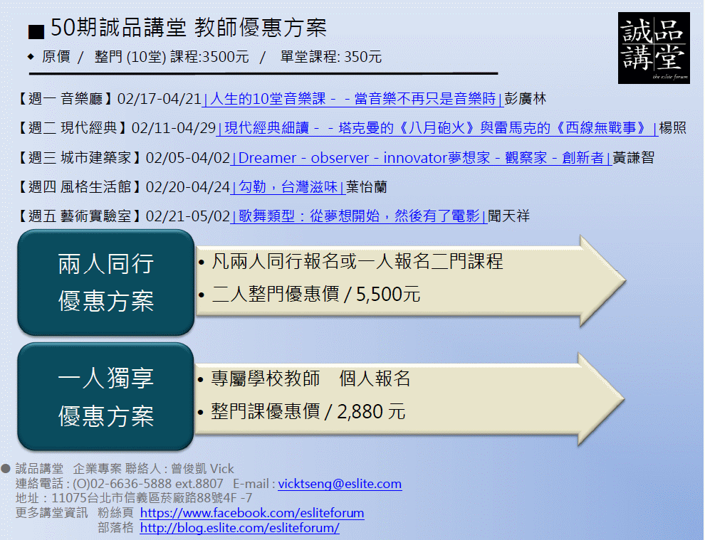 預設 [代轉訊息]誠品講堂 教師報名優惠及課程介紹