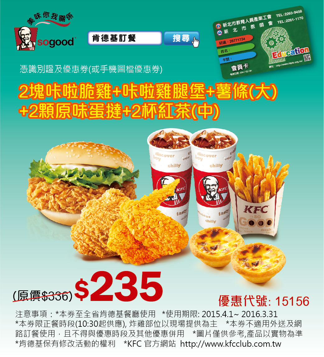憑識別證及優惠券(或手機圖檔優惠券) 2塊咔啦脆雞 + 1份咔啦雞腿堡 +1份薯條(大) + 2顆原味蛋撻 + 2杯紅茶(中)NT$235元 (原價NT$336元)2015/4/1~2016/3/31