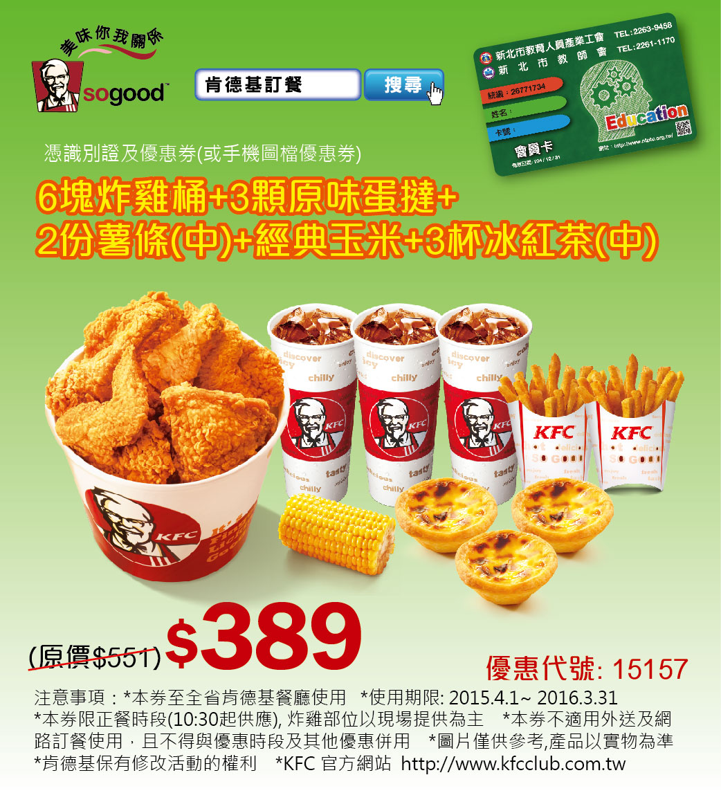 憑識別證及優惠券(或手機圖檔優惠券) 6塊炸雞桶+ 3顆原味蛋撻+ 2份薯條(中)+1份經典玉米+3杯冰紅茶(中) $389元 (原價$551元)2015/4/1~2016/3/31