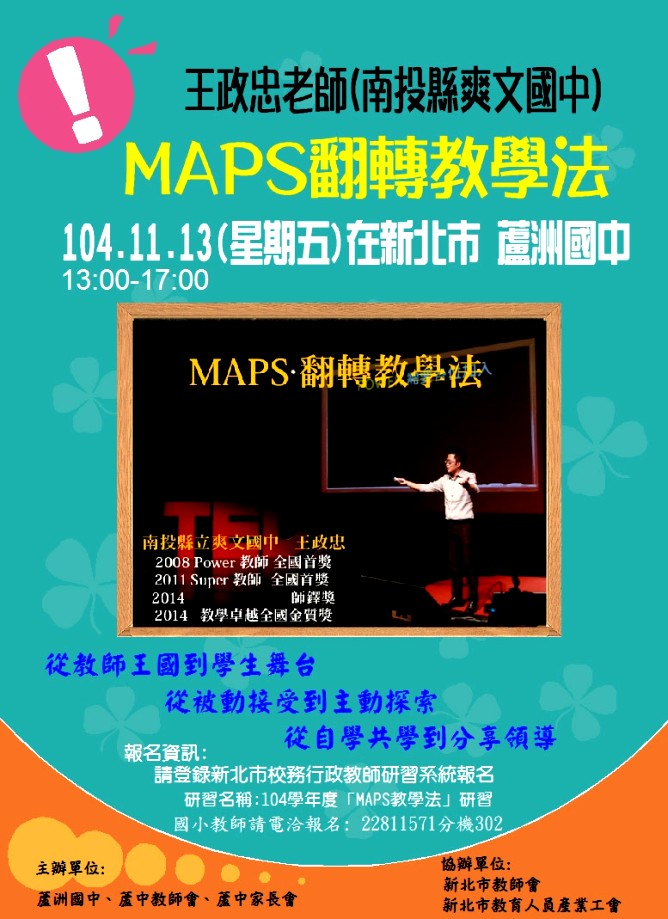 請登錄新北市校務行政教師研習系統報名。名稱:104學年度「MAPS教學法」研習受限報名系統設定,國小老師請電洽報名:2281-1571#302