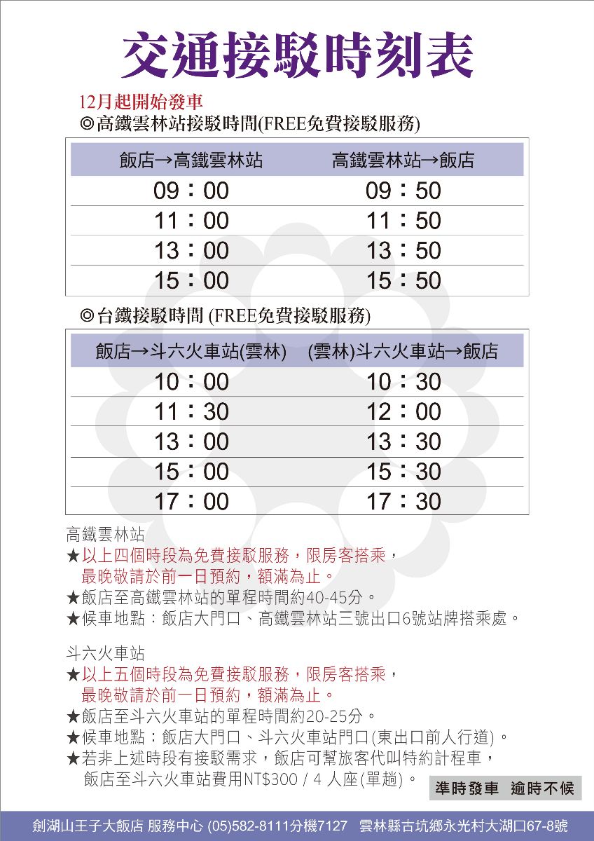 台灣高鐵 雲林站已通車營運,提供劍湖山王子飯店最新接駁資訊如下