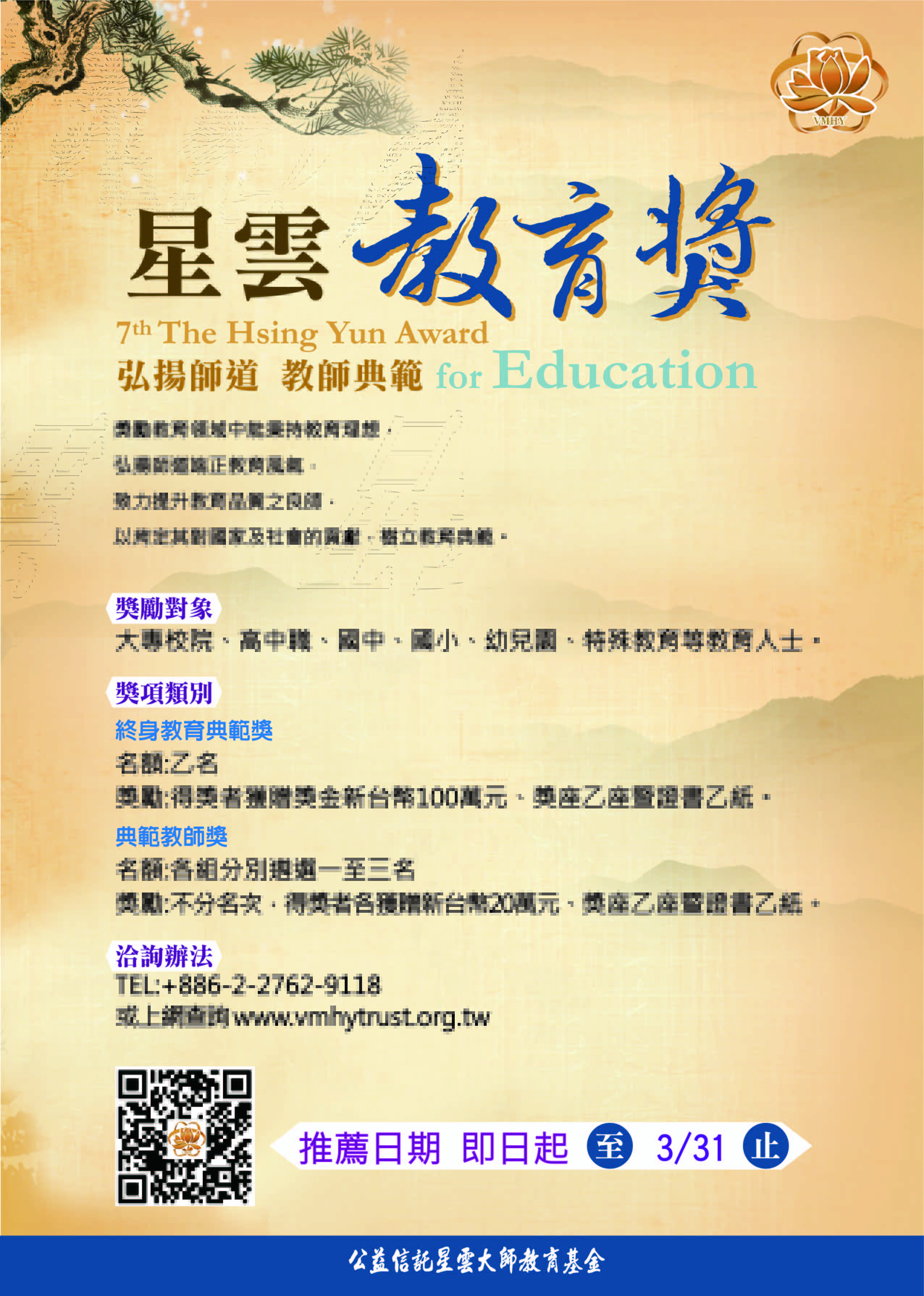 2019第七屆星雲教育獎辦法及申請表及海報,敬請參閱附件。