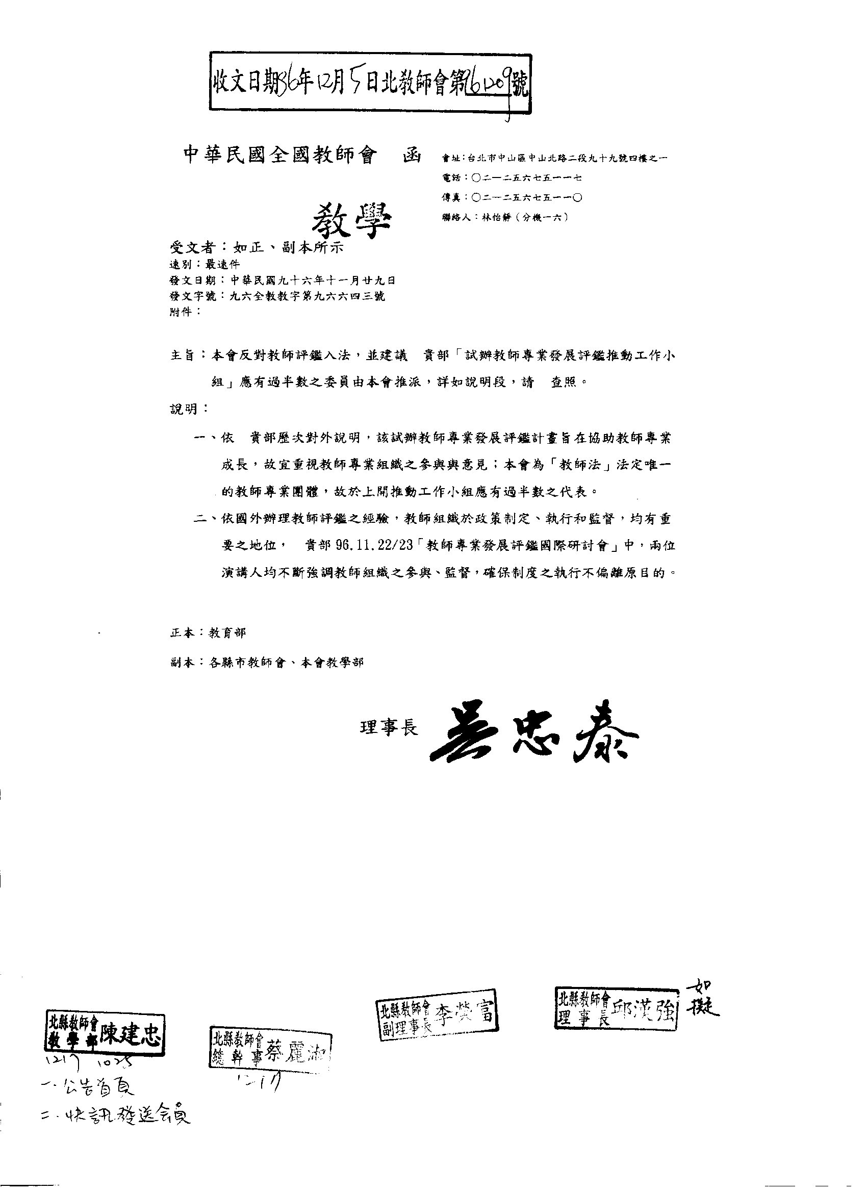 檢附全教會反對教育部將【教師評鑑】入法公文,