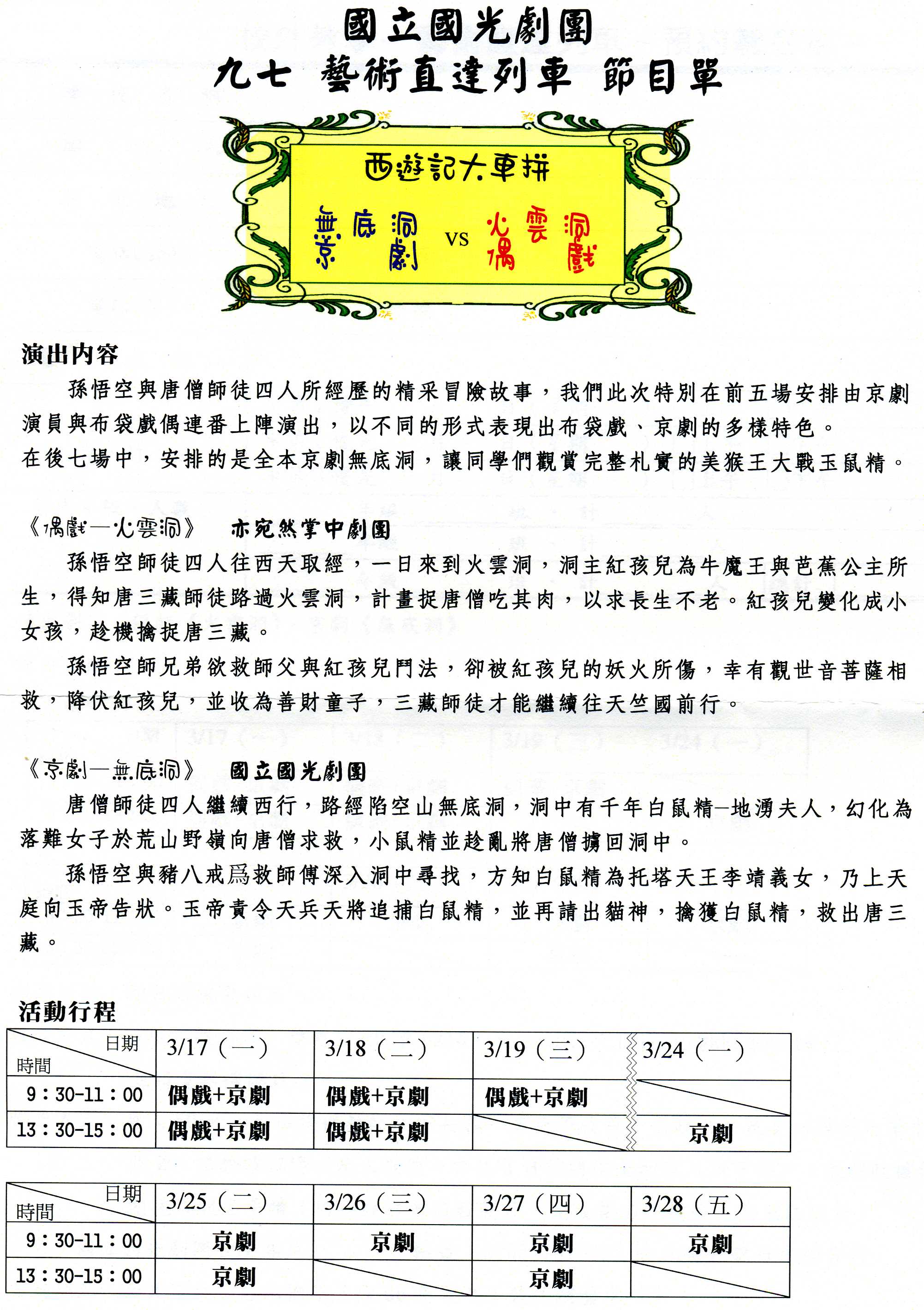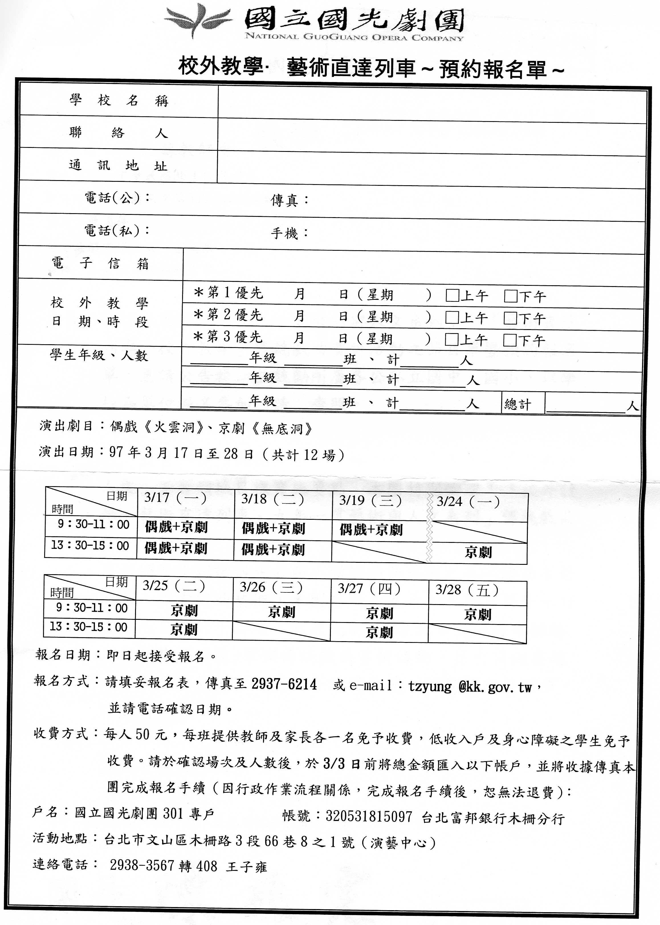 檢附國立國光劇團校外教學活動,活動時間3/17-3/28共12場次,