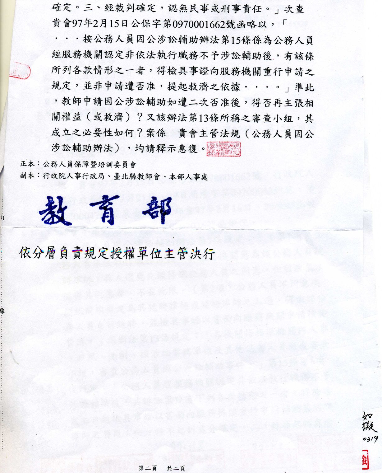 教育部回函:有關「公務人員因公涉訟輔助辦法」第13條、第15條相關執行疑義一案。