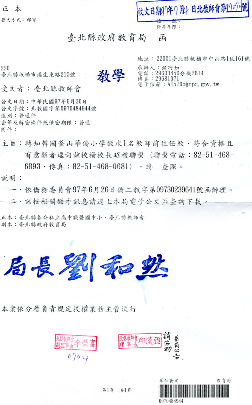 [代轉訊息]教育局函--轉知韓國釜山華僑小學徵求1名教師任教