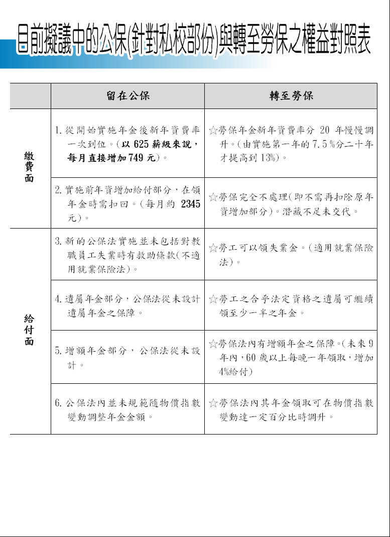 目前擬議中的公保(針對私校部份)與轉至勞保之權益對照表 ,請詳見附件!