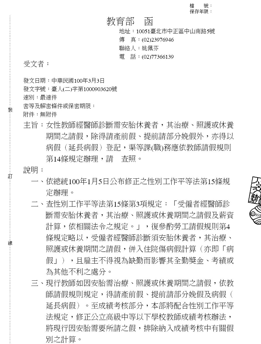 名稱: 	安胎休養給假規範(附件教育部函).jpg