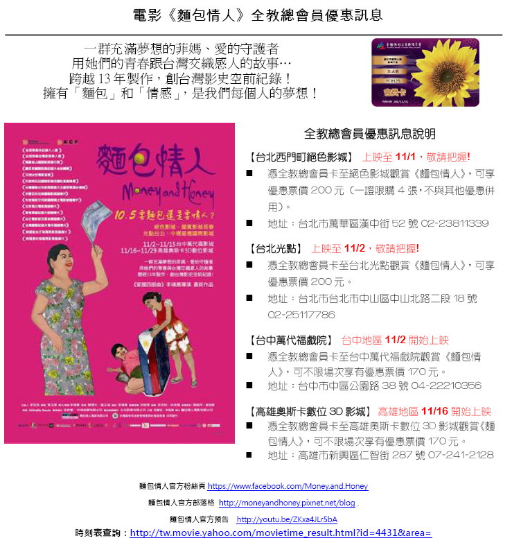 憑全教總會員卡至DM所列電影院購票享有優惠價格,