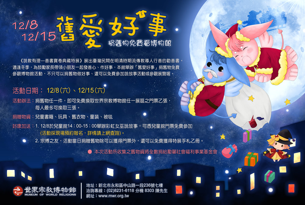 在12/8(六)、12/15(六)這兩個週六捐舊物一件,即可換取宗博館門票,