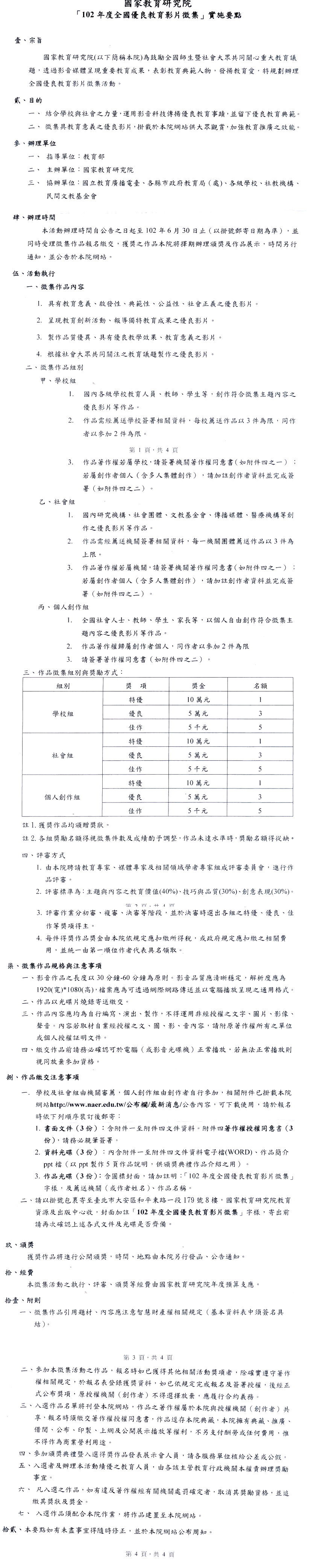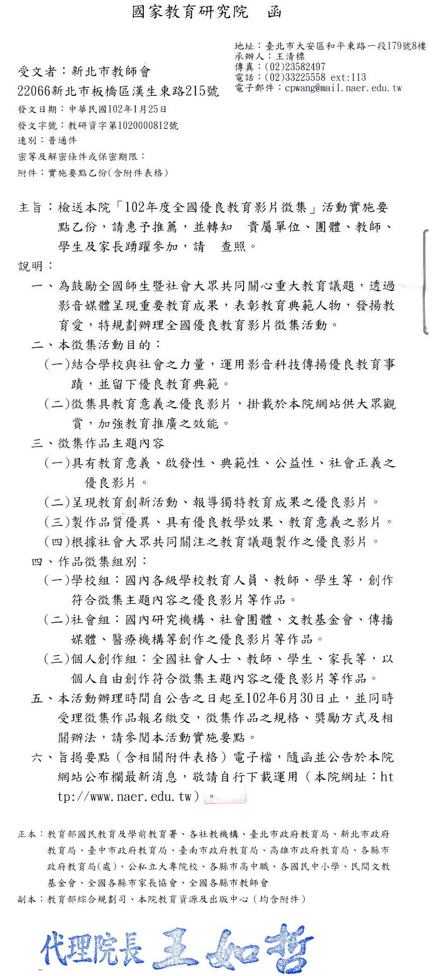 [代轉訊息]轉知國家教育院「102年度全國優良教育影片微集」活動實施計劃