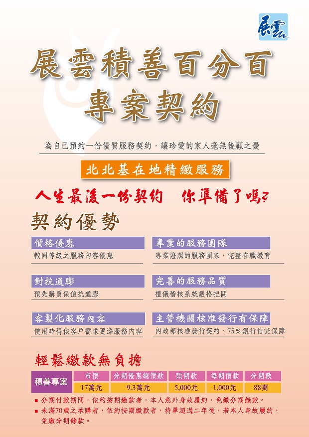 服務內容:民國100年12月14日立法院三讀修正通過(殯葬管理條例),殯葬業者必須在五年 內全數退出醫院,以維持醫院院區環境安寧,新法修正上路後,醫院不得再附設禮堂等殮殯奠祭設施。為自己預約一份優質服務契約,讓珍愛的家人毫無後顧之憂。