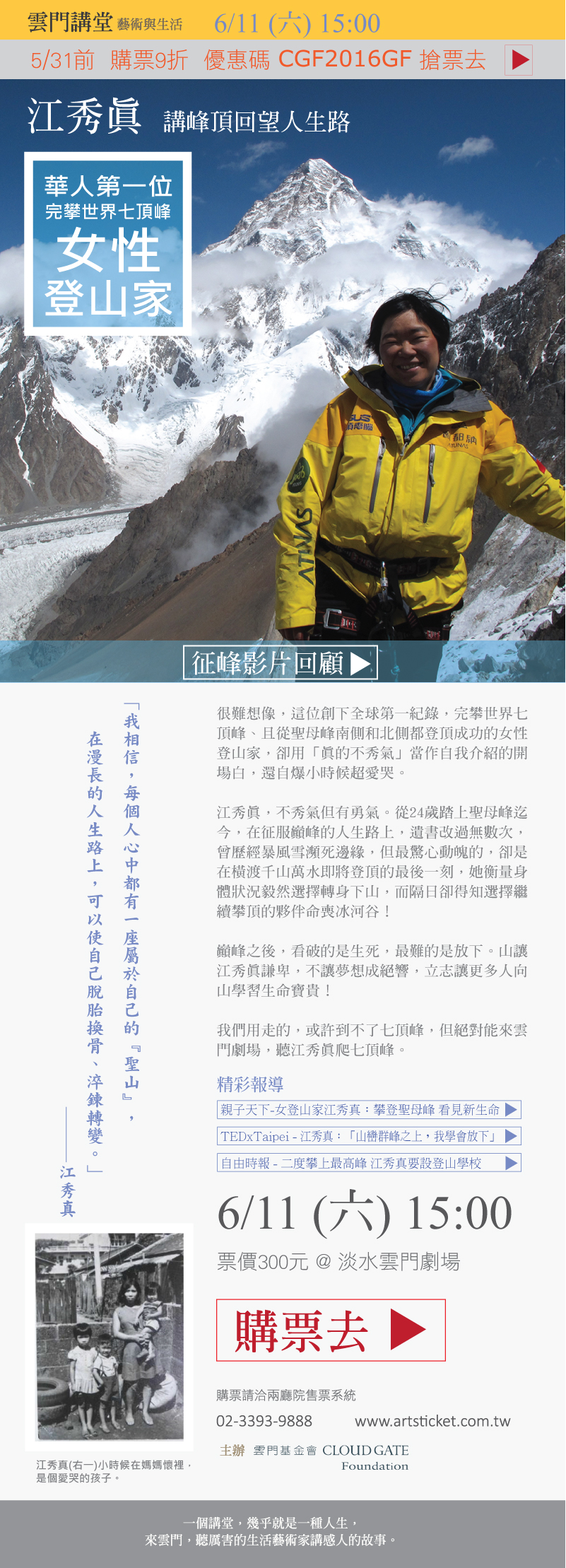 [代轉訊息]雲門講堂:華人首位完攀七頂峰女性江秀真 5/31限時優惠9折