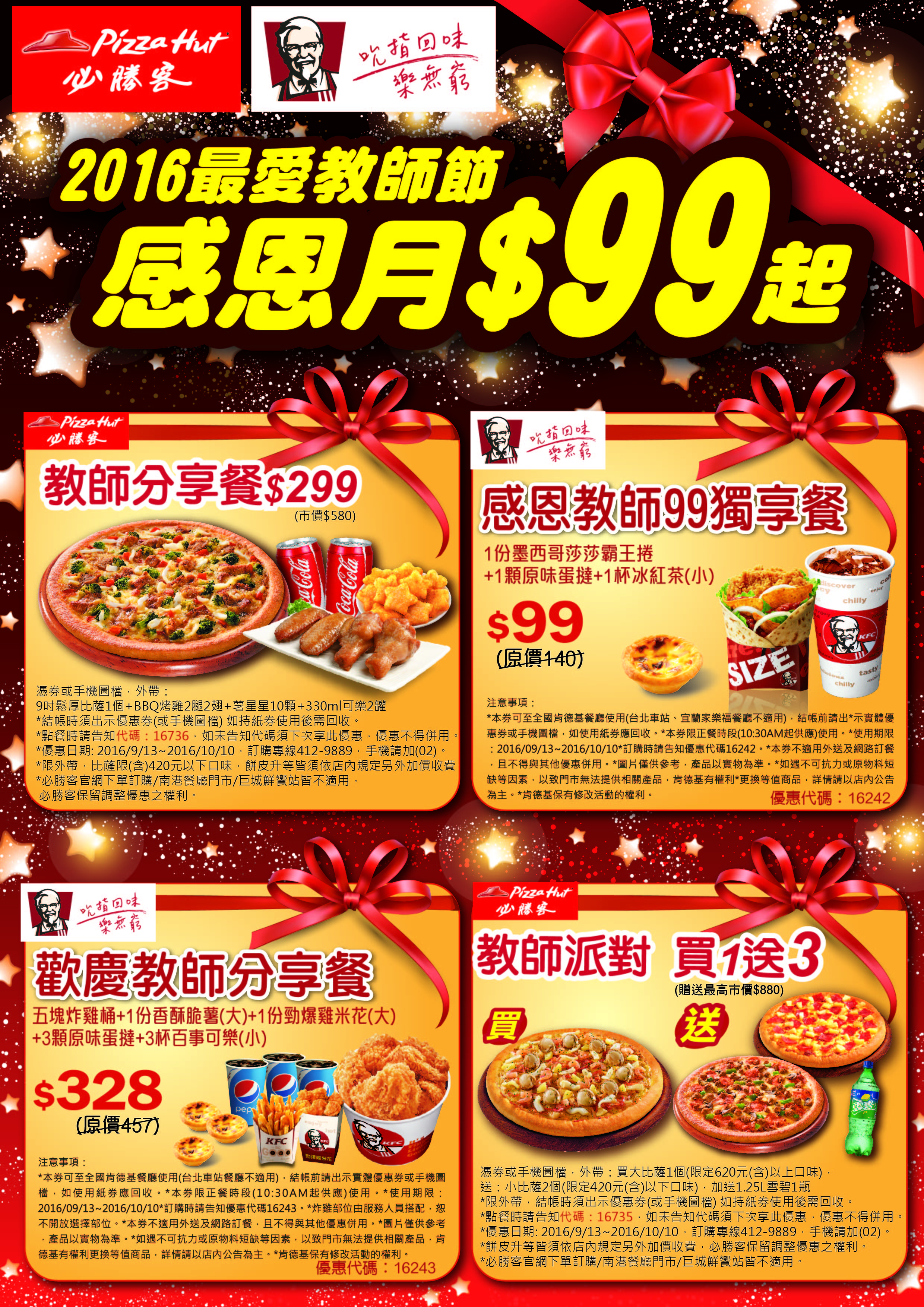 [代轉訊息]肯德基+必勝客2016最愛教師節感恩月$99起
