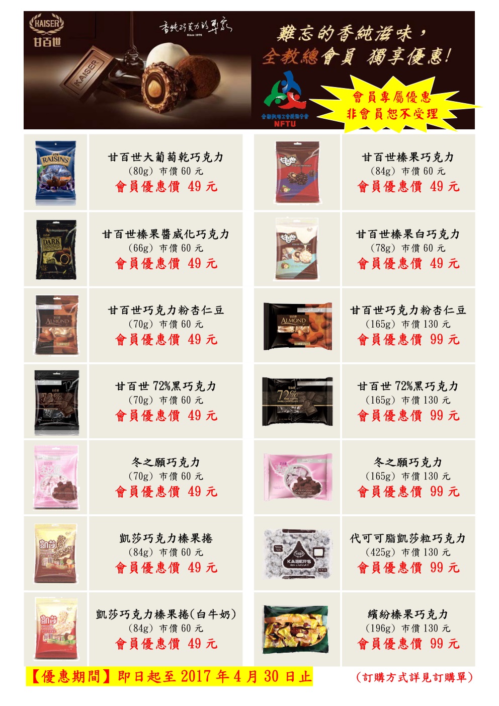 【全教總會員獨享】《甘百世巧克力》特惠活動,即日起至4月30日止