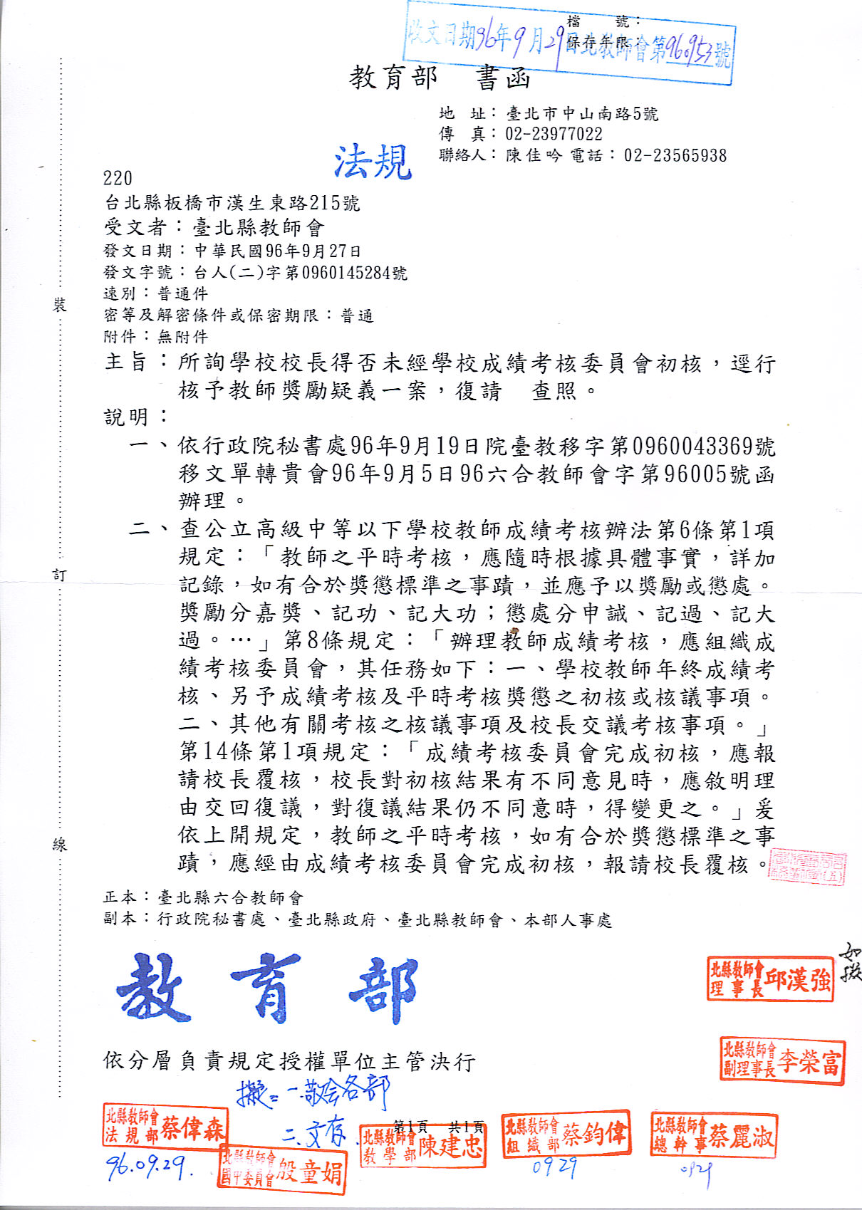 [政策法規部]校長得否未經學校成績考核委員會初核,逕行核予教師獎勵疑義ㄧ案。
