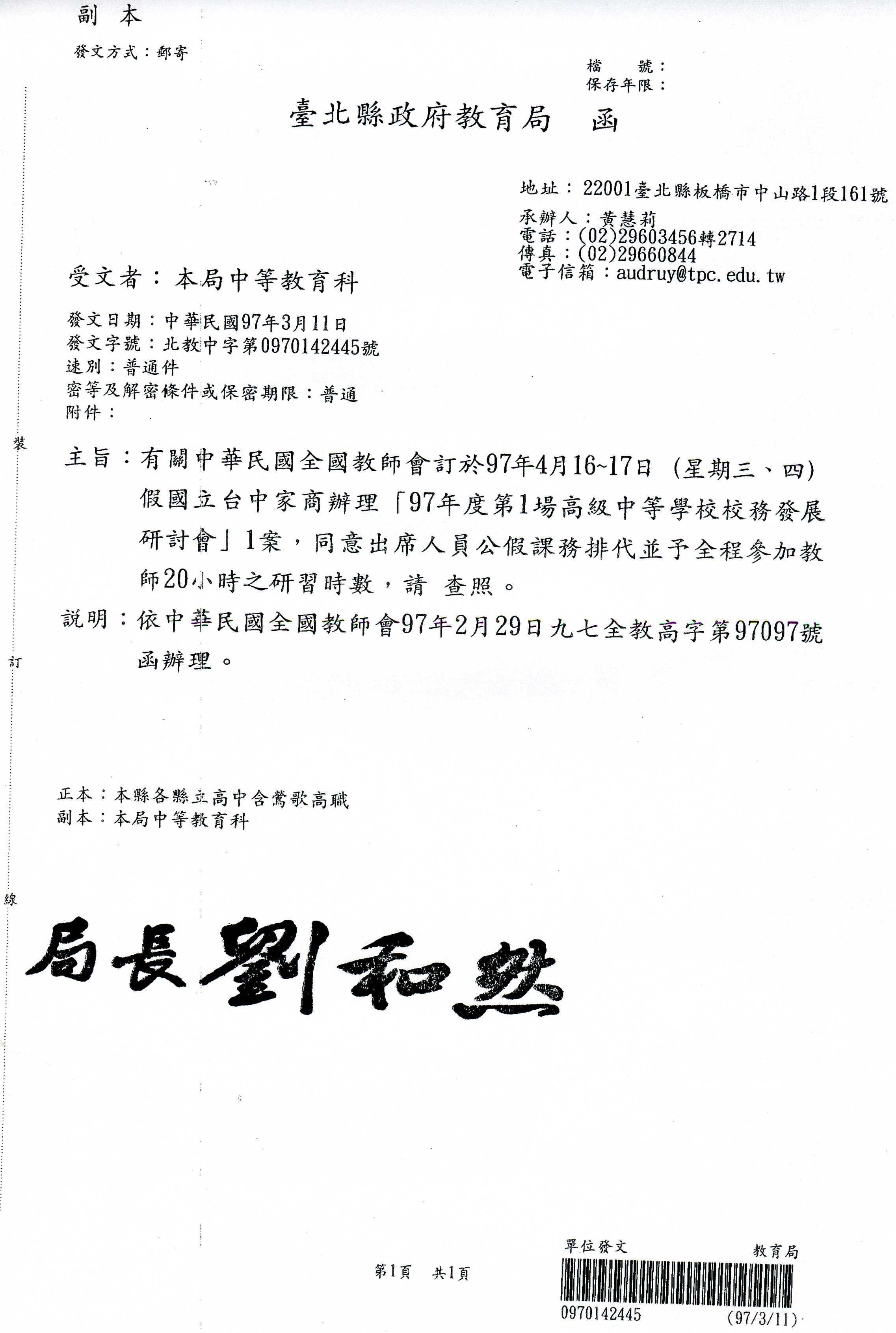 四月16、17日校務法展會議縣府同意公假排代公文