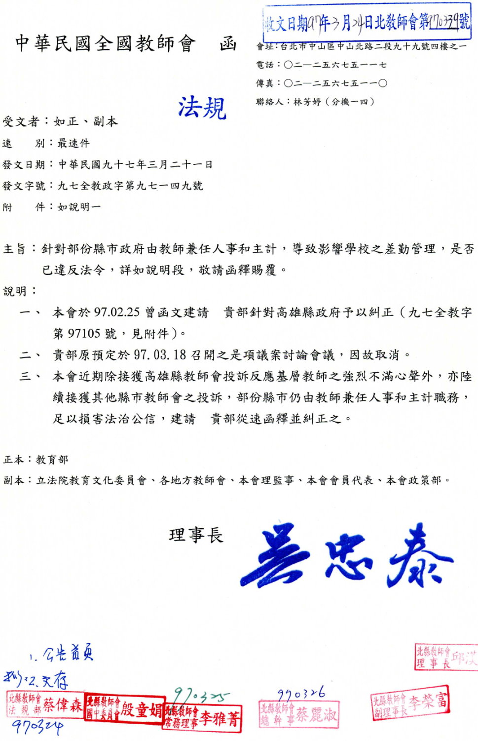 全教會函:建請教育部糾正高雄縣政府有關教師兼任人事和主計一案。