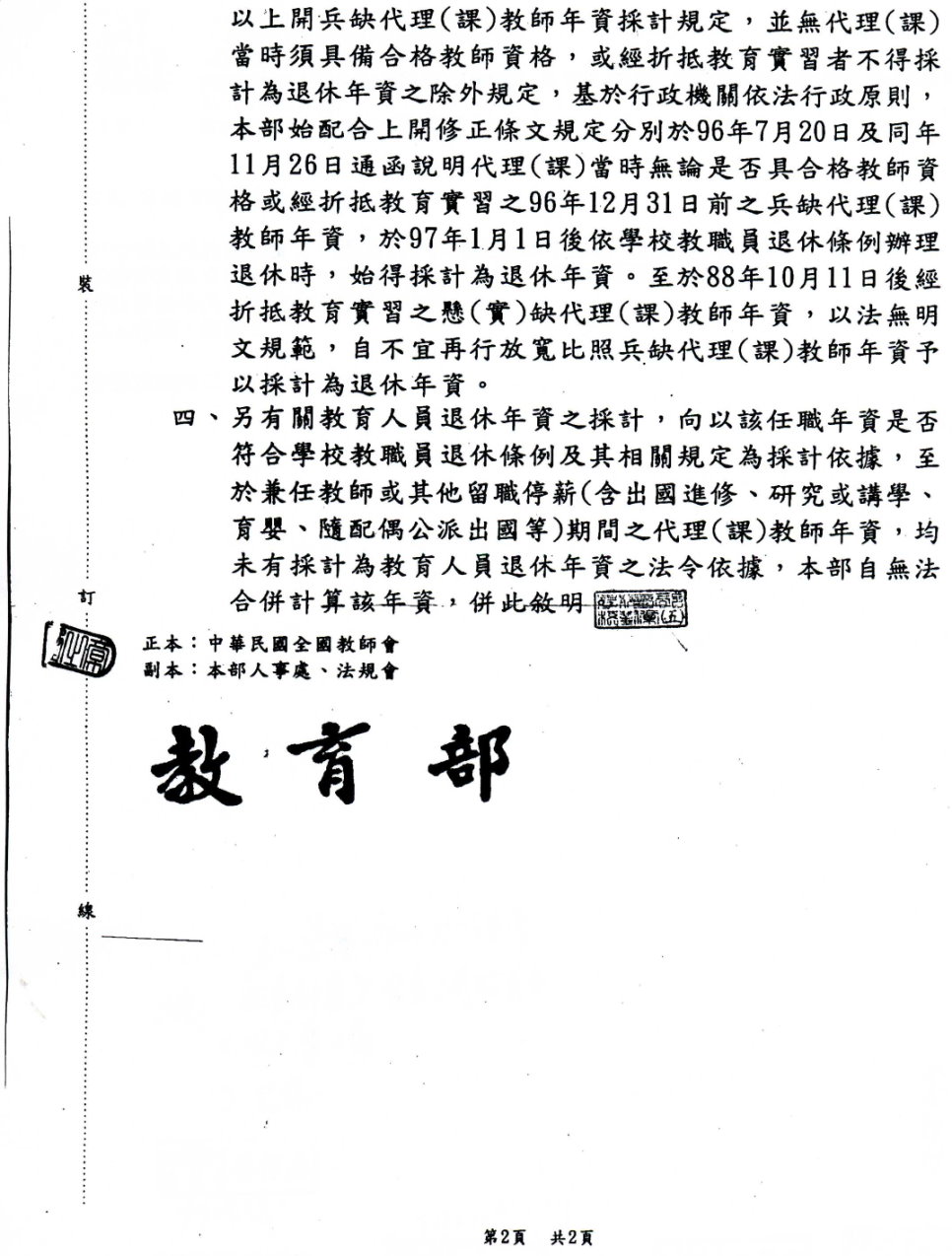 教育部函:有關採計折抵教育實習之懸(實)缺代理(課)教師年資為教育人員退休年資一案。