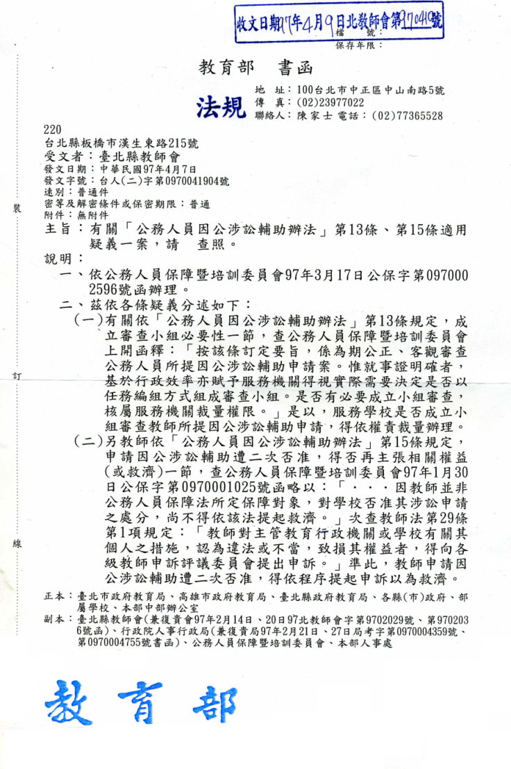 教育部回函:有關[公務人員因公涉訟輔助辦法]第13條、第15條適用疑義