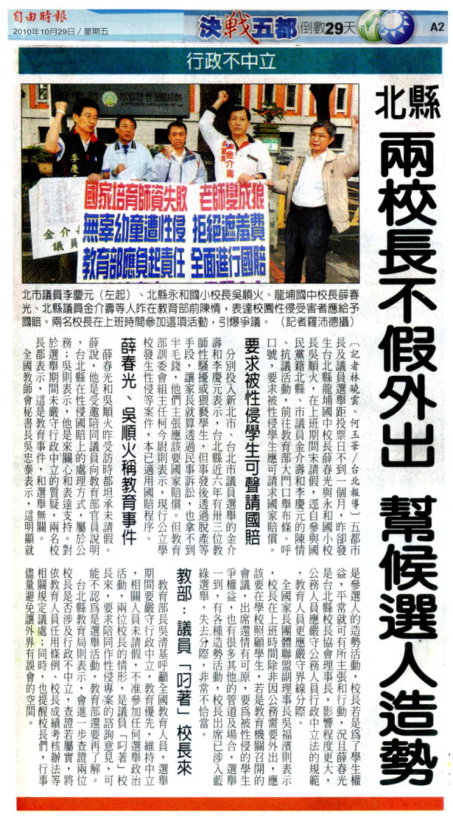 84年公教分途之後,全校具有公務人員身分的除了職員之外,就只有校長,所以校長必須受到行政中立法的約束,雖說臺北縣教育局講得也很義正嚴詞--若有涉及行政不中立,並查證屬實,將依相關規定議處。但是我們相信,教育局一定重重拿起,輕輕放下,甚至不會放下。教育局當務之急只在搶救「被叼走的校長」。