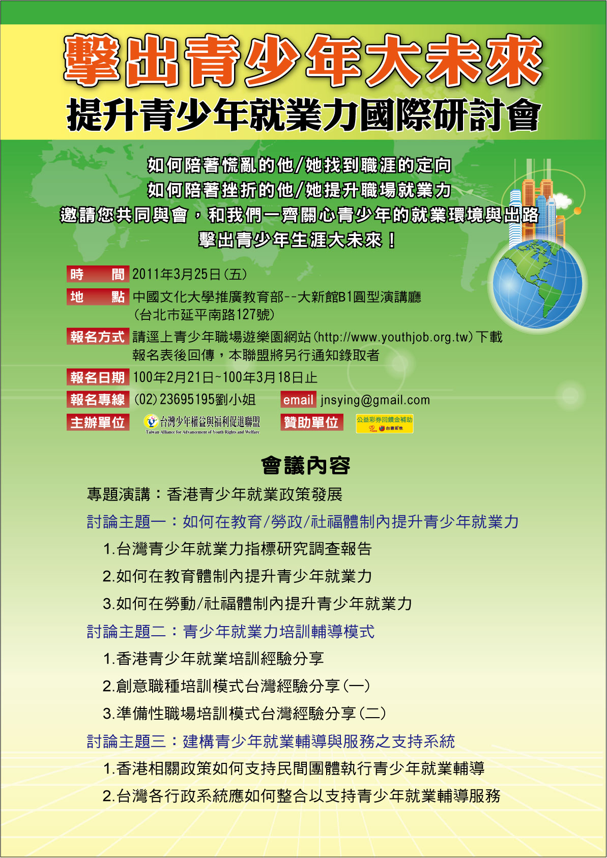 台灣少年權益與福利促進聯盟,將於100年3月25日舉辦「擊出青少年大未來--提升青少年就業力國際研討會」,地點於中國文化大學推廣教育部--大新館B1圓型演講廳(台北市延平南路127號)。會中邀約香港NPO的代表與會,與我們分享香港的青少年服務黃金時期。也期待台灣青少年政策能借鏡國際並於行政系統中整合出貼近青少年實際所需之政策。