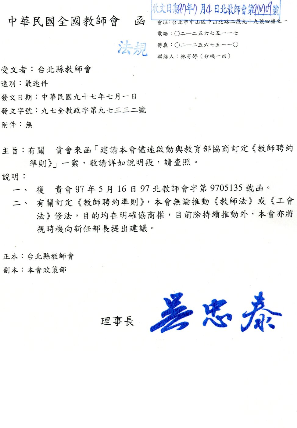 全教會回函:有關臺北縣教師會[建請全教會盡速啟動與教育部協商訂定(教師聘約準則一案)]。