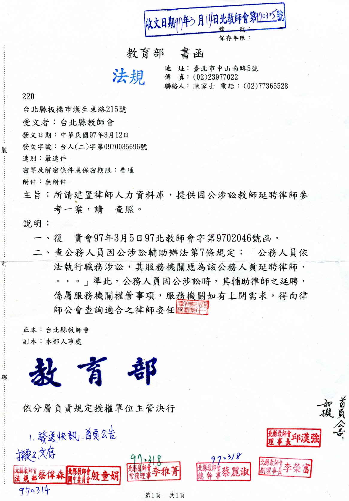 教育部回函:本會所詢請建置律師人力資料庫,提供因公涉訟教師延聘律師參考一案。