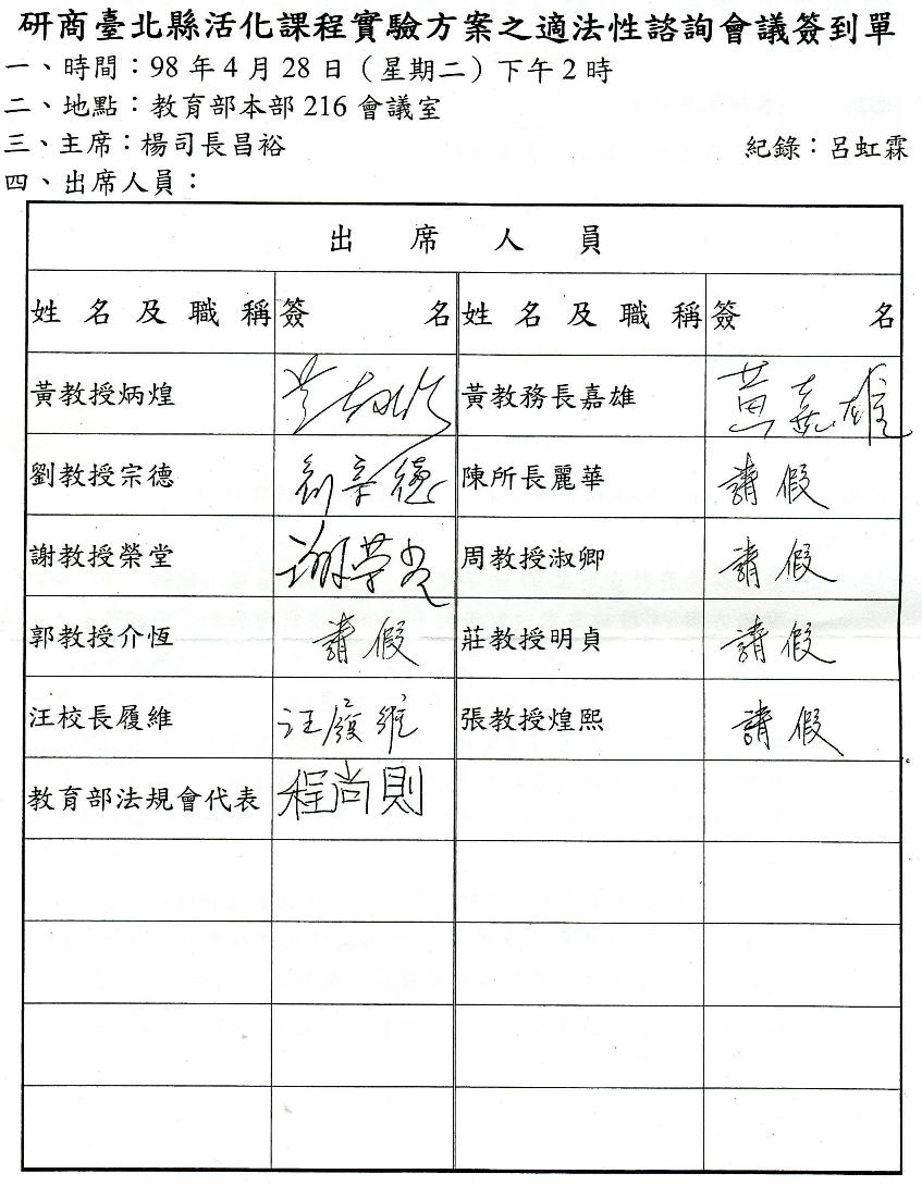 轉98年4月28日教育部活化課程實驗方案適法性諮詢會議會議紀錄,請參閱附件檔。