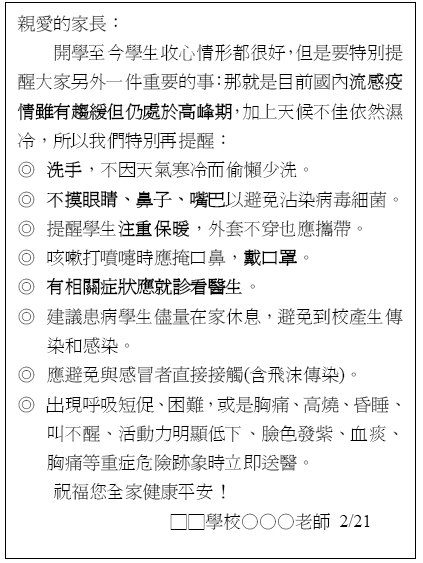 預設 開學後給各校教師會理事長的一封信--提醒大家慎防流感
