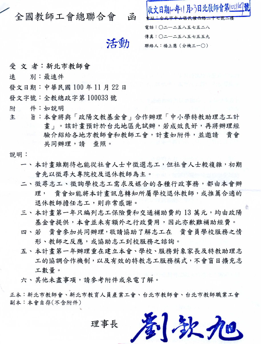 全教總與「政陽文教基金會」合作辦理「中小學特教助理志工計畫」案,